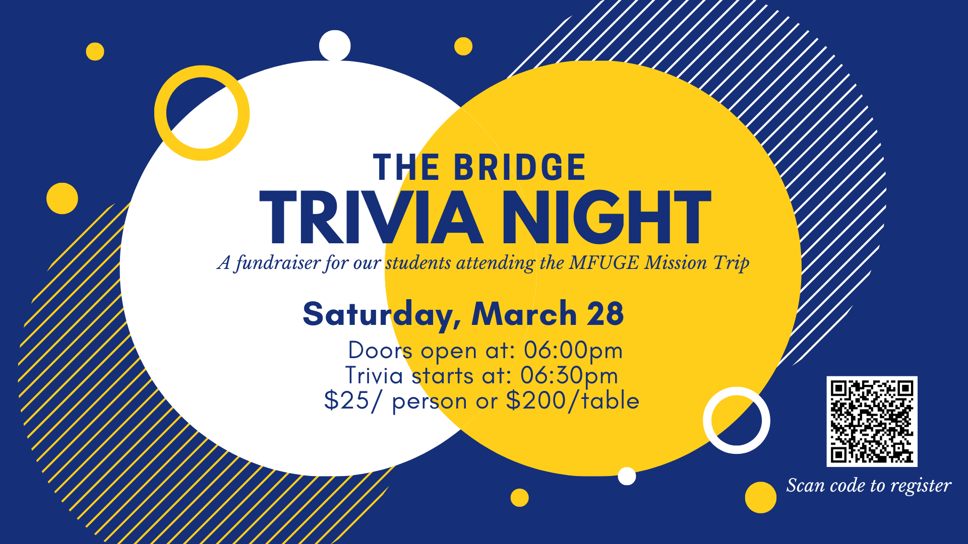 Trivia Night- Trivia at The Bridge- It’s time for Trivia Night at The Bridge. Gather your friends for an evening of fun and enjoy ten rounds of trivia emceed by Jeff Maynard. Tickets are $25 a person or reserve a table for 8 people for $200. All proceeds from the evening will help our Bridge Students attend MFuge- a mission trip serving St. Louis. Save your spot by registering at https://thebridgealton.churchcenter.com/registrations/events/3428505