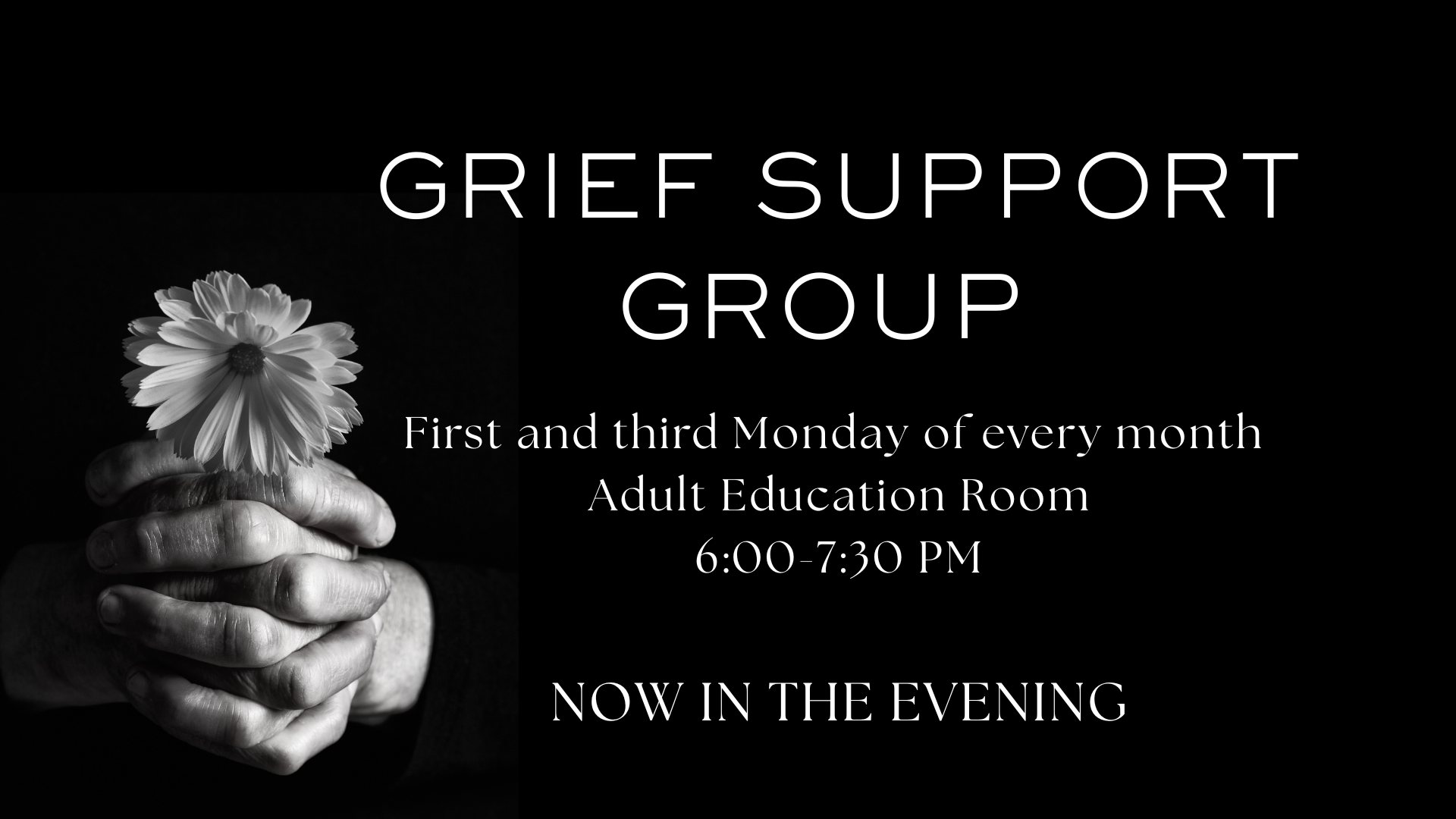 Grief Support Group- If you are experiencing grief from a loss, we invite you to join our grief support group- a bridge of hope, for those who are suffering. NOW OFFERED IN THE EVENING, the Grief Support Group meets the first and third Mondays of every month from 6:00-7:30 pm, in the Adult Education Room. For more information, talk to Eileen Cheatham.