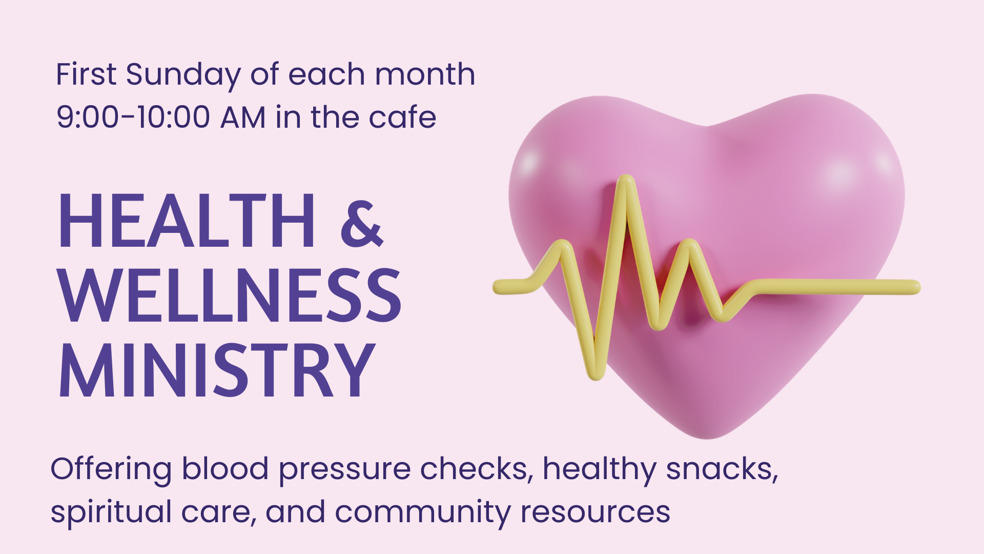 /Health and Wellness Ministries- Our Health & Wellness Ministries invite you to stop by the café on the first Sunday of each month from 9:00–10:00 AM. We offer free blood pressure checks, and healthy snacks like fruit and cheese. If you’re in need of spiritual care, Mike Solomon will be available for prayer and conversation.