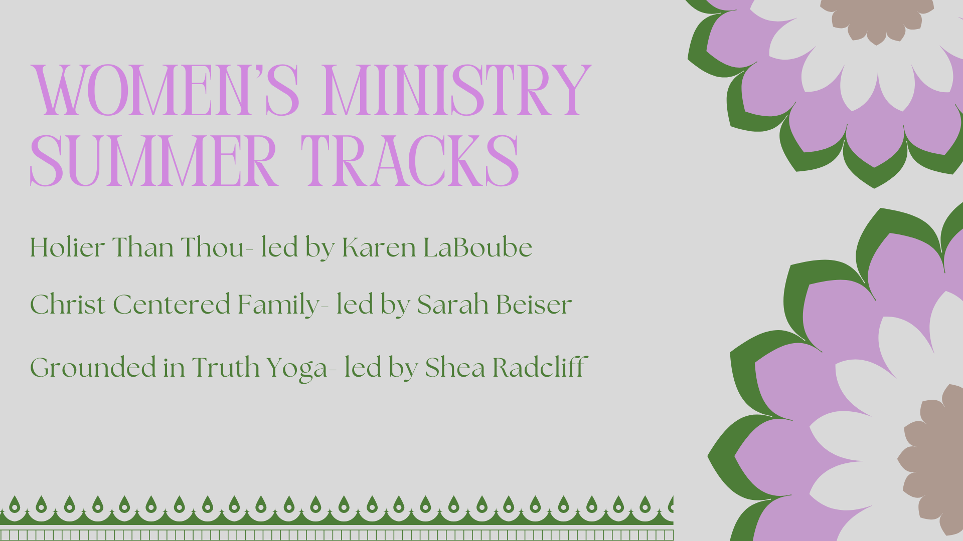Women’s Summer Tracks- This summer, step into deeper faith and community with one of our unique Summer Tracks—designed just for women. These groups go beyond traditional Bible studies, creating space for connection, growth, and shared experience across different interests and stages of life. Find the one that fits your season and join us!